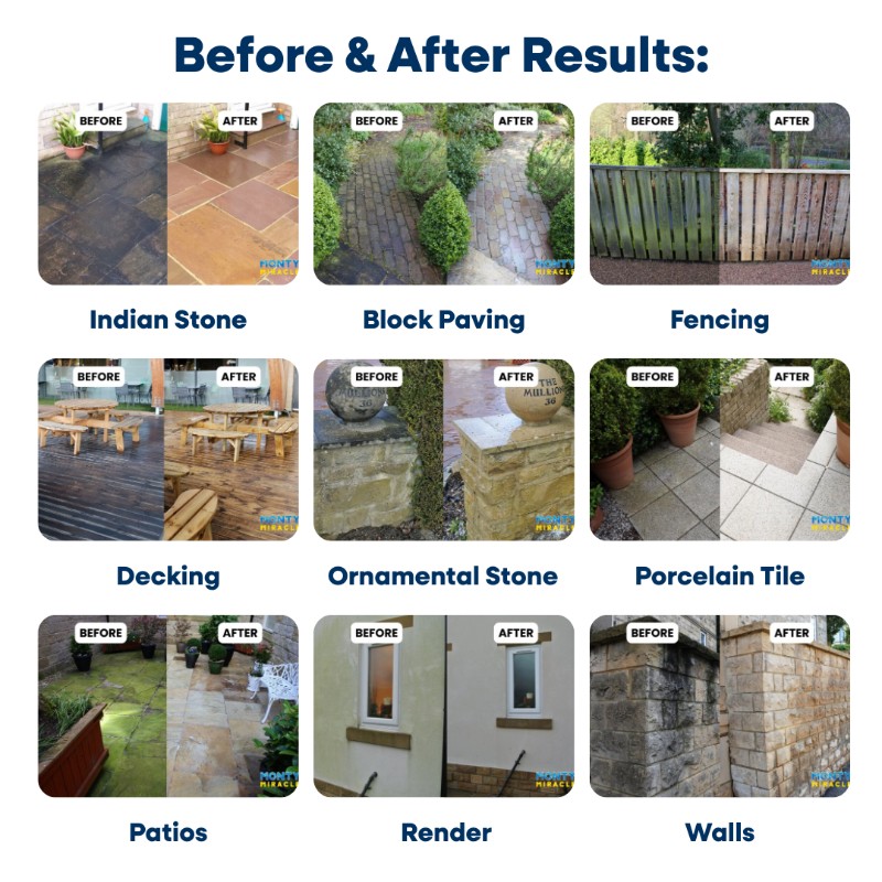 Monty Miracle® has revolutionised outdoor cleaning with our patented instant-action formula and method that delivers professional results in minutes, not hours or days. Unlike traditional cleaners that take weeks to show results, Monty transforms your outdoor surfaces in just 6-10 minutes – we really do mean fast! (read instructions before use)