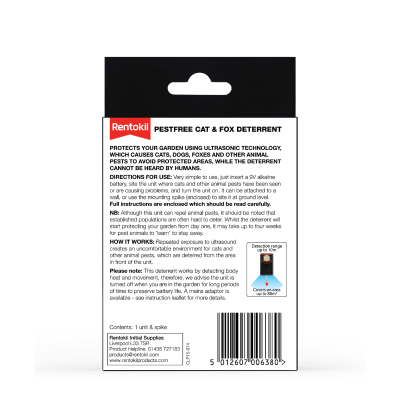 Battery operated unit deters cats, dogs and foxes from gardens. Small and compact, easy to use. Ultrasonic technology made in the UK. Contains one unit & mounting spike.